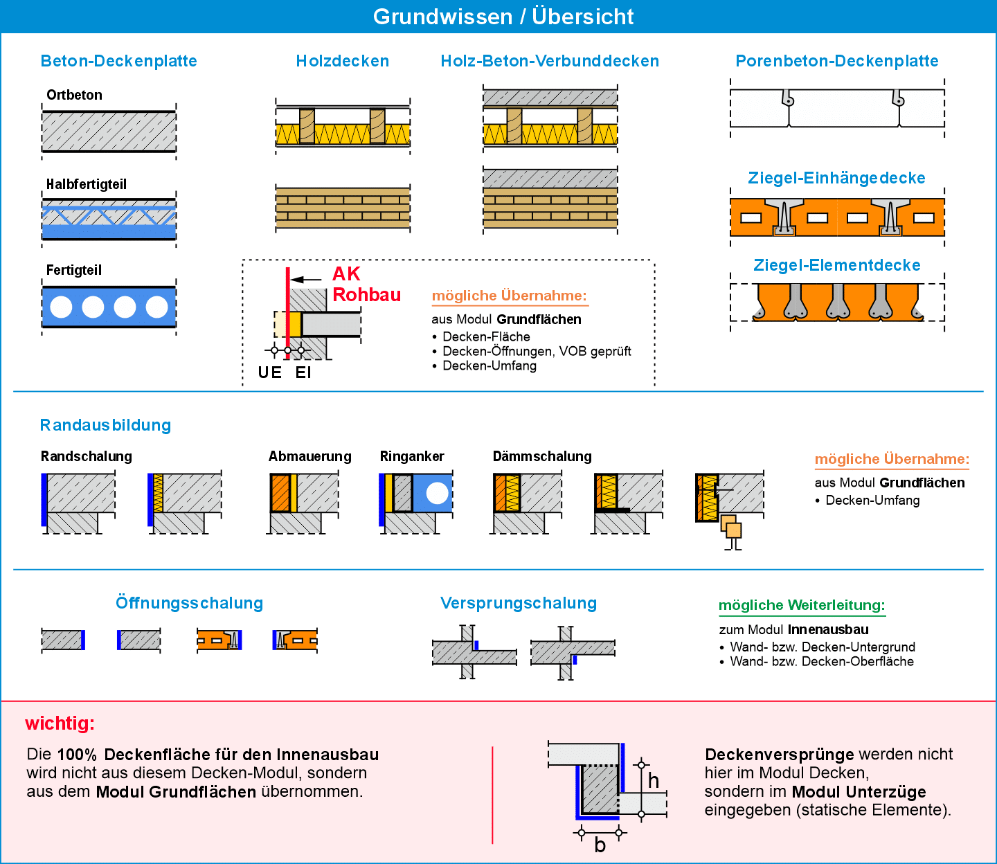 In diesem Modul werden Beton-Deckenplatten (Massiv-, Halbfertigteil- und Fertigteildecken), untere Deckenschalungen, Holzdecken (Balkendecken, Hohlkastendecken, Rippendecken, Brettstapeldecken genagelt, Brettstapeldecken gedübelt, Brettsperrholzdecken, Brettschichtholzdecken und Profil-Holz-Element-Decken), Holz-Beton-Verbunddecken (Verbund im Fertigteilwerk oder auf der Baustelle mit Ortbeton oder Beton-Fertigteilen), Randausbildungen, Öffnungsschalungen, Versprungschalungen, Zulagen für Decken mit Gefälle und für geneigte Decken, Höhenausgleichstreppen/ -rampen, Aufzugsüberfahrten, etc. erfasst.