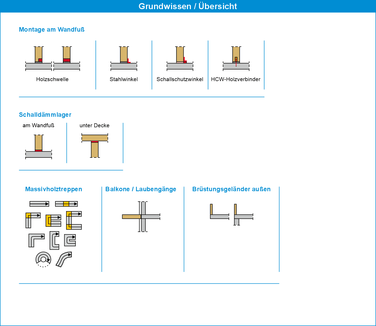 In diesem Modul werden die Art der Montage von Holzbau- und Holzmassivwände, Schalldämmlager am Wandfuß und unter der Decke, Massivholztreppen, Holz-Balkone, Holz-Laubengänge und Holz-Brüstungsgeländer erfasst.