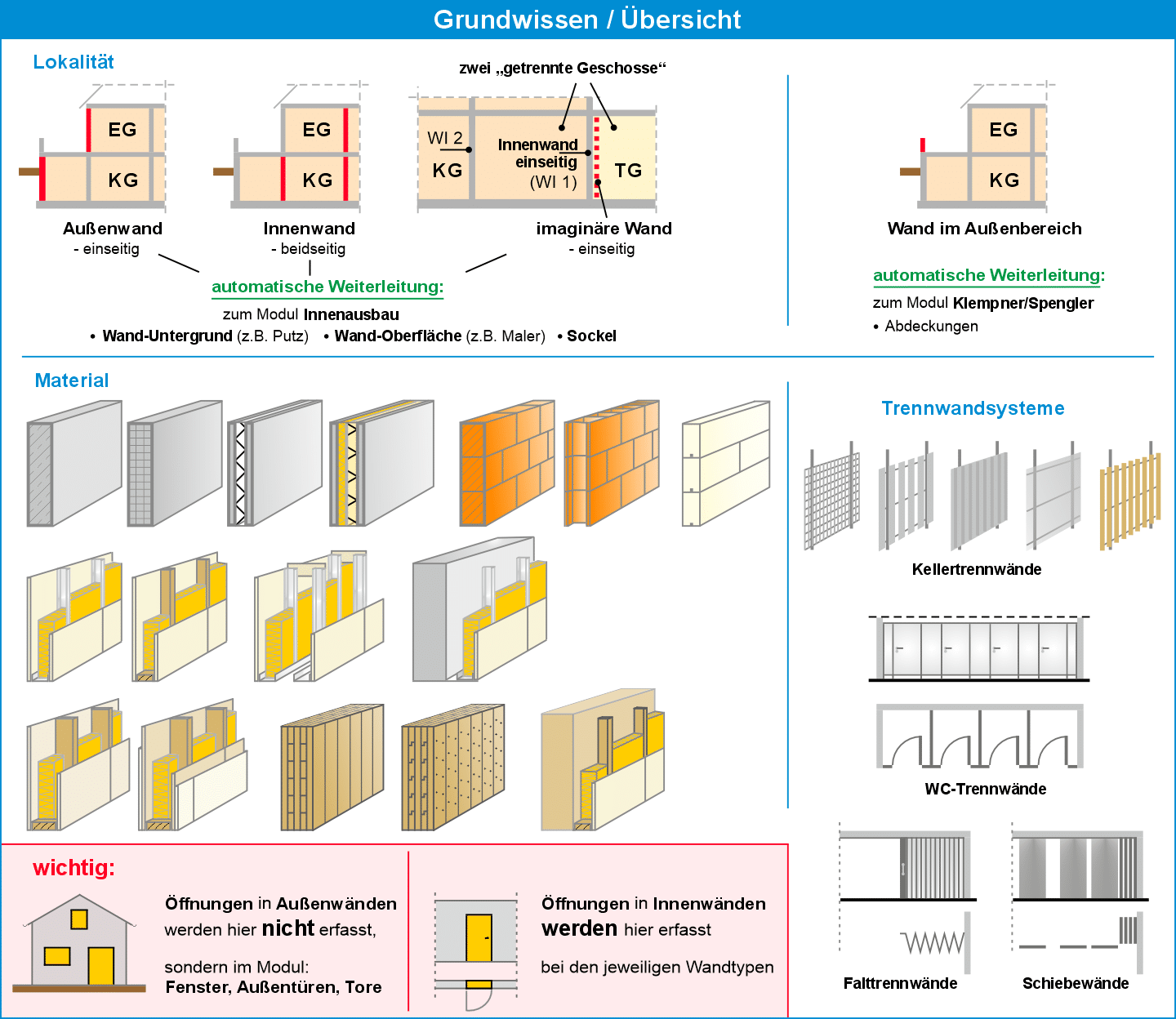 In diesem Modul werden Arbeitsfugen (z.B. mit Fugenblech, Fugenband), Dehnfugen, Kellerfenster, Lichtschächte, Entlüftungsschächte, Treppen, Tronsolen, Balkone, Isokörbe, Hauseinführungen, Winkelstützwände, Trennfugen, weiterer Betonstahl, Decken- und Wanddurchbrüche, Wandschlitze, Kernbohrungen etc. erfasst.