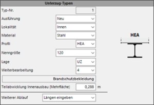 Je nach ausgewähltem Profil wie z. B. IPE, HEA, HEB, HEM, U, … und Lage des Stahlträgers errechnet sich automatisch aufgrund der hinterlegten Formeln das Stahlgewicht, die Beschichtungsfläche und auf Wunsch auch eine Trockenbau-Bekleidung oder eine Trockenbau-Brandschutzbekleidung. Entsprechende Mehrflächen für den Innenausbau werden automatisch generiert und weitergeleitet.
